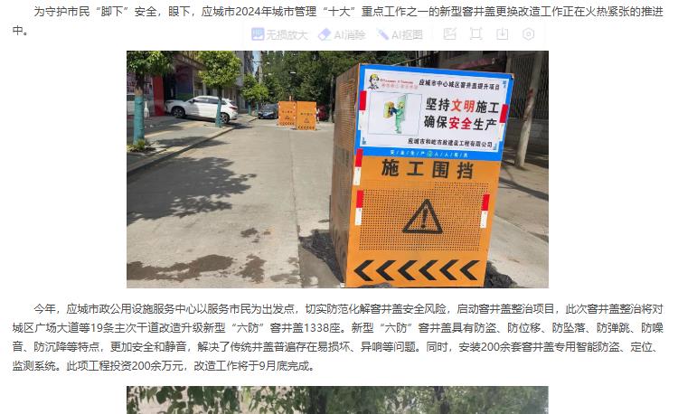 為守護市民“腳下”安全,眼下,多地開展城市新型窨井蓋更換改造。如應城市2024年已開展切實防范化解窨井蓋安全風險,啟動窨井蓋整治項目,此次窨井蓋整治將對城區(qū)廣場大道等19條主次干道改造升級新型“六防”窨井蓋1338座。新型“六防”窨井蓋具有防盜、防位移、防墜落、防彈跳、防噪音、防沉降等特點,更加安全和靜音,解決了傳統(tǒng)井蓋普遍存在易損壞、異響等問題。同時,安裝200余套窨井蓋專用智能防盜、定位、監(jiān)測系統(tǒng)。