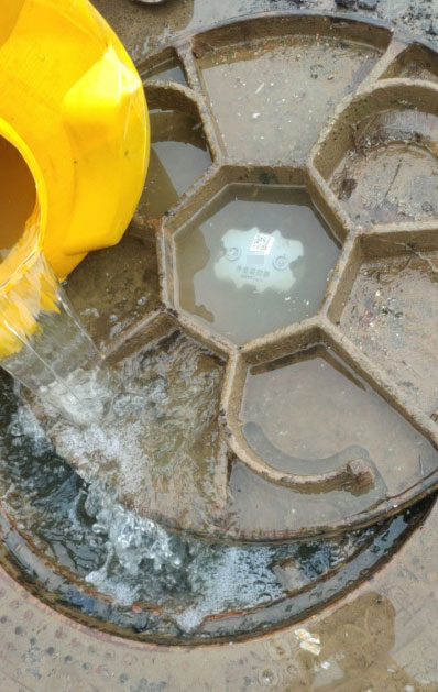 ▲倒水測試窨井蓋水位預警靈敏度
