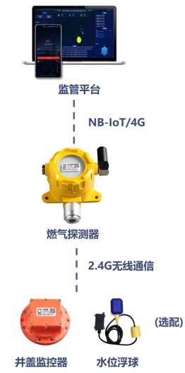 燃氣閥井智能監測是通過NB-IoT/4G的閥井智能監測終端監測燃氣閥井可燃氣體濃度;在氣體濃度超標時,可發送報警信息至云端平臺;云端平臺在處理報警信息后,將通知運維管理人員;運維人員根據收到告警信息后,前往燃氣閥井檢修,排除安全隱患。