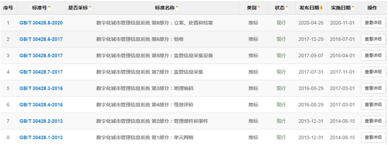 為了規范數字化城市管理信息系統的建設與運行,推進城市管理數字化、精細化,加快數字化城市管理向智慧化升級,提高城市管理和公共服務的水平與效率,住房和城鄉建設部制定《數字化城市管理信息系統》(GB/T30428)系列國家標準。2013年,由全國智標委歸口管理,北京市東城區城市監督管理中心等單位起草的《數字化城市管理信息系統第1部分:單元網格》和《數字化城市管理信息系統第2部分:管理部件和事件》正式發布,此后2016年至2020年《數字化城市管理信息系統》系列標準相繼發布實施。